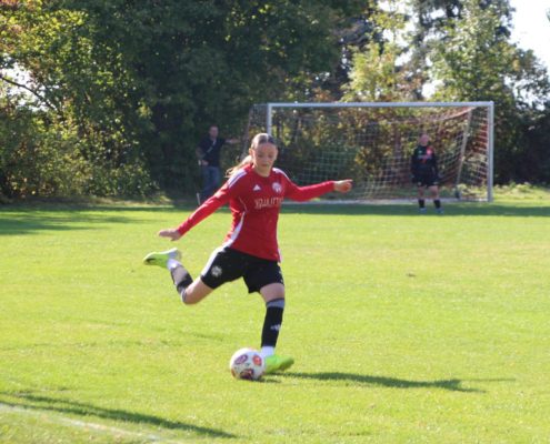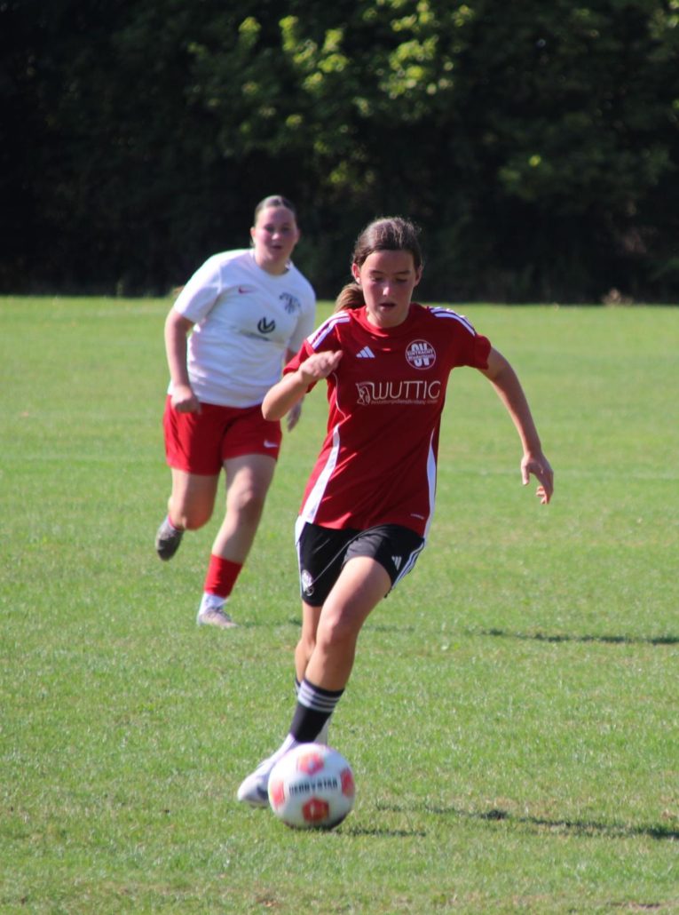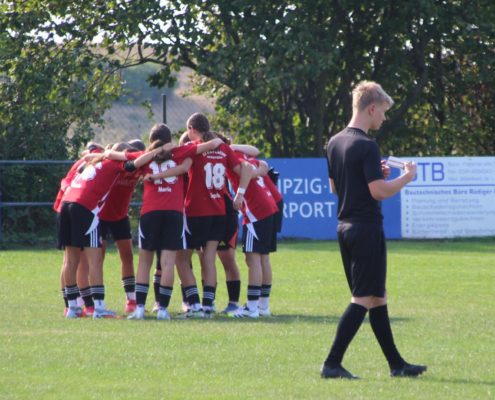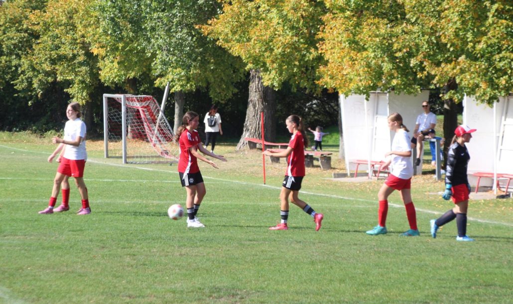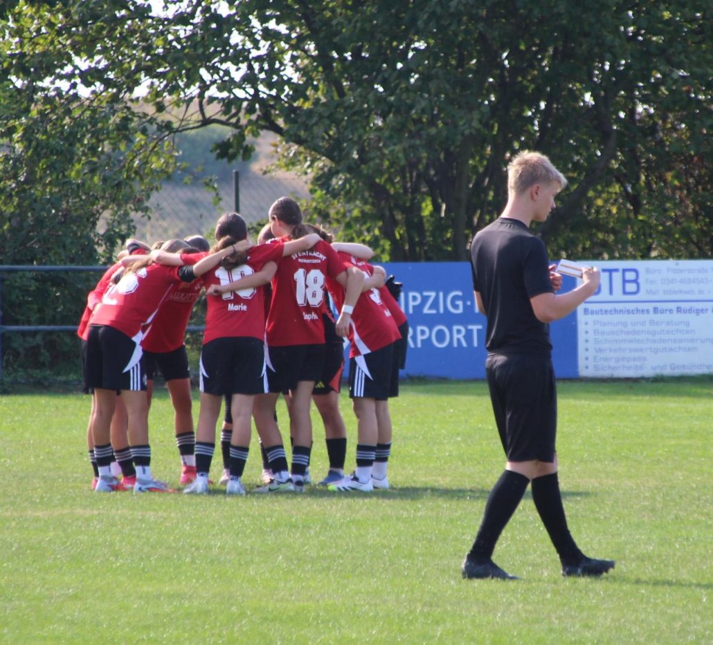 Pünktlich 11 Uhr erfolgte der Anpfiff vor 100 Zuschauern 🔥 und beide Teams tasteten sich vorsichtig in die Partie hinein. Dann aber schaltete die Eintracht einen Gang hoch, erhöhte das Tempo und den Druck, die Mädels kamen zu den ersten Chancen und in der 14. Minute durch Marie zur 0:1 Führung ⚽. Seehausen kam ebenfalls einige Male in Richtung Wiederitzscher Tor, aber die Abwehr und Josi im Tor hatten alles jederzeit im Griff. Mia W., Laura und Melina gewannen ihre Zweikämpfe und schalteten sich auch häufig ins Spiel nach vorne ein. In der 24. Minute traf Svea nach Vorlage von Marie zum 0:2 ⚽. Danach malträtierten beide Spielerinnen nacheinander den Pfosten, aber das Tor blieb stehen. Zum Glück, denn Svea traf dann in der 28. Minute zum 0:3 ⚽. Dies war dann auch der Halbzeitstand, denn bis zur Pause hagelte es zwar noch Chancen ohne Ende (Melissa und Marie), aber es fiel kein Tor mehr. Dafür fielen Blätter, denn Svea krachte den Ball volle Kanone an einen Baum. Was war das für eine erste Hälfte! Jede Spielerin hat alles gegeben, ob in der Abwehr, im Mittelfeld oder im Angriff. Klasse Pässe, robuste Zweikämpfe, viele Abschlüsse und auch die Laufwege ohne Ball waren sehenswert, eine saubere Teamleistung. Seehausen hielt aber kämpferisch dagegen und verhinderte einen größeren Rückstand. Da war es kein Wunder, dass seitens der Blasmusik der Wunsch in Richtung der SGS kam: „Einer geht noch, einer geht noch rein!“