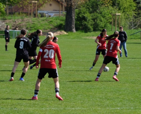 Pünktlich mit dem Anpfiff wurde auf Angriffsmodus geschalten und los ging es. Die üblichen 10 Minuten Eingewöhnung schenkten sich die Mädels heute, vermutlich aus Angst davor, dass wieder jemand einen Abbruch herbeiführt. Aber der Schiri heute hatte nichts dergleichen im Sinn. Was für ein Glück. Unsere Mädels erspielten sich von Anfang an gute Möglichkeiten und kamen schon in der 7. Minute zum 1:0 durch Svea ⚽. Man merkte, das gesamte Team wollte heute nichts anbrennen lassen und kam durch einen super Spielaufbau, schnelle Spielzüge und gute Übersicht zu weiteren Chancen. Diese nutzte wieder Svea und stellte durch Tore in der 14., 16. und 17. Minute auf 4:0⚽😱. Dieser Zwischenstand war hoch verdient, auch weil Gegenangriffe häufig schon ab dem Mittelfeld unterbunden wurden und sich die Abwehr ins Spiel nach vorne einschalten konnte💪. Dann kamen die Mädels vom LFC doch einmal durch und ließen sich die Chance nicht nehmen, um in der 29. Minute auf 4:1 zu verkürzen. Das Tor ging in Ordnung, weil sie sich nicht hinten reinstellten, sondern auch munter nach vorn spielten. Allerdings traf Svea schon in der 31. Minute zum 5:1 und kurz darauf war Melissa dran⚽. Sehr früh im Spiel hielt sie ihre Hand zwischen gegnerischen Stollen und Rasen und musste erstmal raus🙈. Aber mit Eisbeutel und einer Bandage wurde sie rasch repariert und machte in der (laut Stoppuhr) 34. Minute ihr Tor zum 6:1⚽, natürlich mit dem Fuß. Offiziell war es die 35. Minute, aber mit Melissas Rückennummer 34 nehmen wir doch lieber die Messung der Stoppuhr. Mit diesem Zwischenstand ging es in die Halbzeit und eine bärenstarke Eintracht durfte sich über eine hohe Führung freuen. Josi im Tor wurde wenig gefordert und konnte bislang durch präzise Pässe einige Angriffe aufbauen, unsere Abwehr um Anna-Lena, Melina und Mia W stand super und war auch offensiv eingestellt👏. Laura machte gewohnt souverän mal wieder alles auf einmal (außer im Tor, denn das ist belegt) und der Angriff um die ununterbrochen wirbelnde Svea und die sehr stark spielenden Sophie und Melissa beschäftigte die Gegnerinnen ohne Pause. Auch Mia H schaute sich bandagenverstärkt in der ersten Hälfte schon sehr aktiv in der gegnerischen Hälfte um, denn heute sollte schon noch so einiges passieren. Unser Maskottchen beschäftigte indes eher die Frage, ob nicht ein Hotdog in der Pause eine sehr gute Idee wäre. 😂