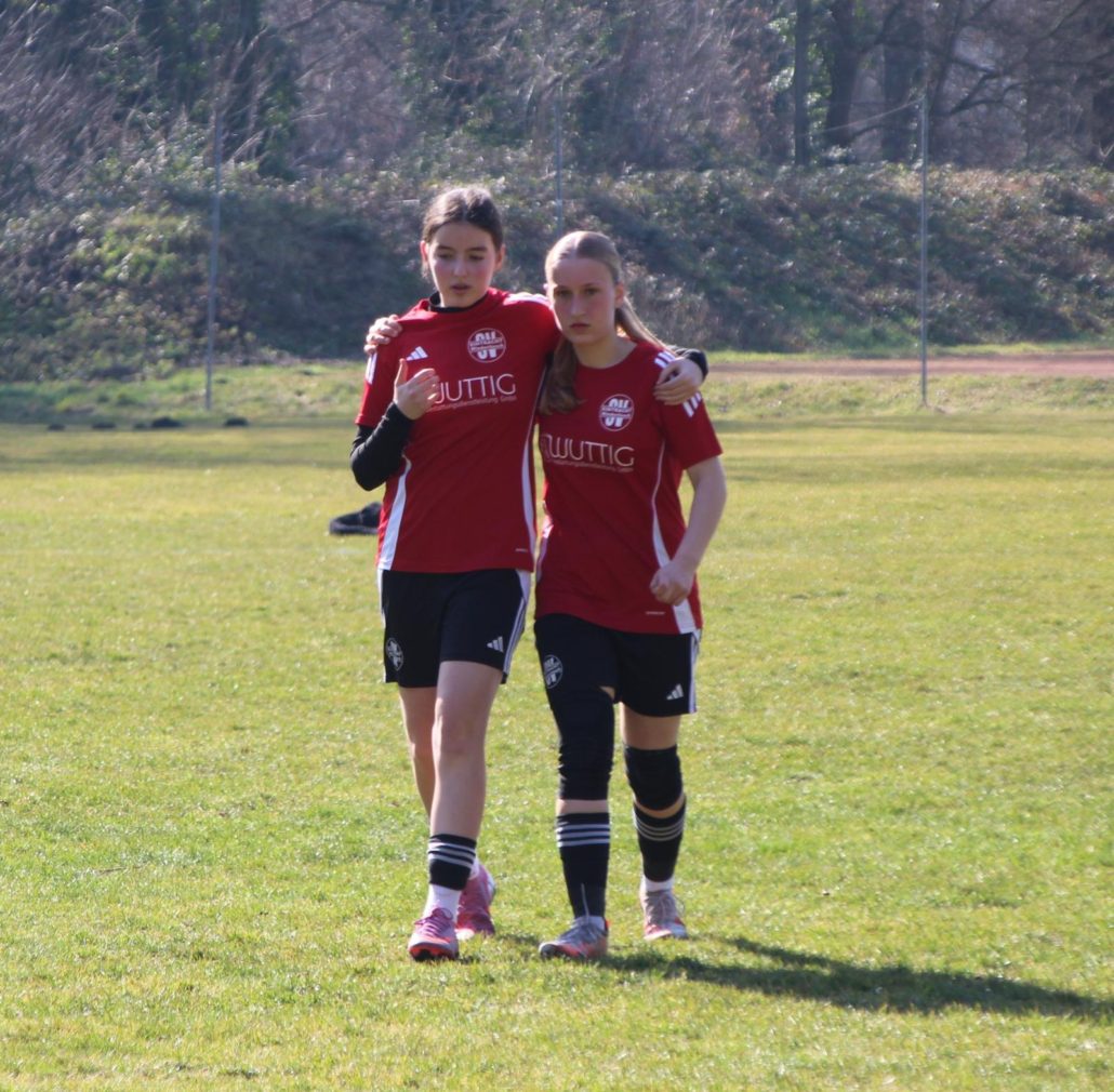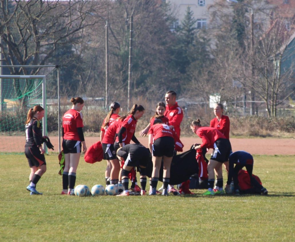 ENDLICH! Nach einigen Monaten in der Halle mit tollen Turnieren, Testspiel (viele Grüße nach Zorbau) und ganz viel Soccerworld ging es nun wieder in der Landesklasse weiter. Es gab gleich zwei Begegnungen in dieser Woche und die Vorfreude war groß, bei einigen Mädels auch die Aufregung. Auf jeden Fall gibt es optische Neuigkeiten! Nein, die Mädels sehen immer noch so aus und die Zahl der Zöpfe ist auch gleich geblieben. Aber in Sachen Outfit hat sich einiges getan. Das Team inkl. der Trainer freut sich über sehr schicke Trainingsanzüge und Aufwärmtrikots. Auf letztere wird noch gesondert eingegangen. Ein riesiges Dankeschön an der Stelle von uns allen an die Firma Wuttig Bestattungsdienstleistung GmbH (bestattung-wuttig.de), die Sachen sehen toll aus und das kleine Logo mit dem Sensenmann ist immer noch sensationell. ☺️