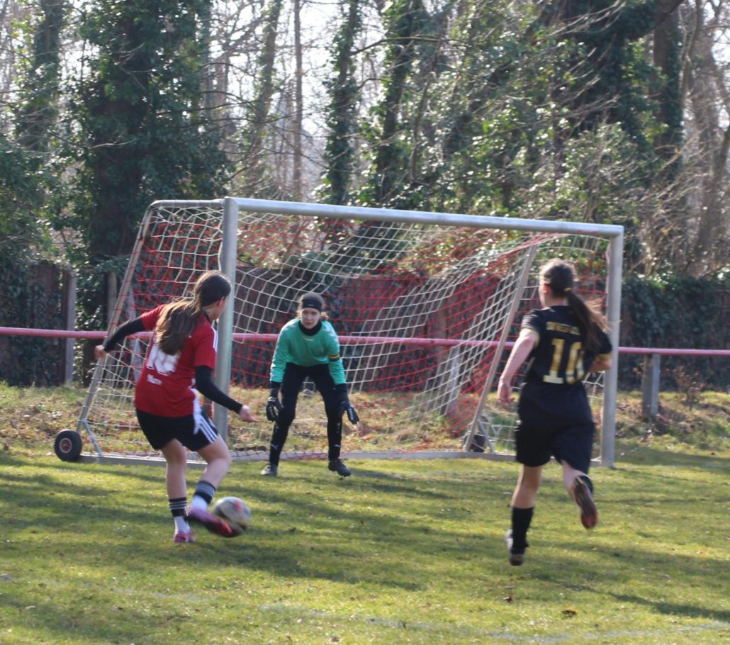 Am Freitag konnten sich die Mädels in der Schule vom Spiel erholen, denn eine lange Erholung gab es nicht. Am Samstagvormittag musste das Team (unverändert bis auf Anna-Lena, die nach Verletzung wieder dabei war) schon wieder reisen, diesmal ging es zum SV West 03 auf das berühmt-berüchtigte Feld mit Gullydeckel. 🤪 Einmal haben wir schon dort gespielt und erinnern uns an ein zähes und bis zum Schluss echt knappes Spiel. Und lediglich 17 Gegentore in dieser Saison zeigen auch eine stabile gegnerische Abwehr. Dafür schauten heute mehrere hundert Leute immer ein paar Sekunden zu, weil der Mammutmarsch am Sportplatz vorbeiführte. Zählt trotzdem. 😁 Mit Anpfiff wurde schnell klar, dass es heute kein Selbstläufer wird. Die Gegnerinnen (in den ersten Minuten noch in Unterzahl) kannten ihren Platz natürlich genau, ließen sich nicht überrennen und wenn´s mal einer kurzen Pause zum Luftholen bedurfte, wurde die Murmel weit aus dem Spielfeld geballert. Die 03er-Abwehr stand sicher und die Hüterin hielt alles, was auf ihr Tor kam. Dazu noch ein paar schnelle Angriffe Richtung Kasten der Eintracht und schon hatten wir einige Probleme, ins Spiel zu finden. Auch der Ball narrte uns andauernd. Er kam schon ungefähr dort auf dem Rasen an, wo er sollte, aber wohin er dann sprang, wusste niemand so genau. Bei unseren Mädels fehlten vielleicht auch ein paar Körner, offenbar war die Schule doch nicht so erholsam. Folgerichtig ging es dann mit einem 0:0 in die Halbzeit, die Mädels übernahmen die Halbzeitansprache selber und die Trainer gingen Kaffee trinken. Das war auch nötig…. ☕