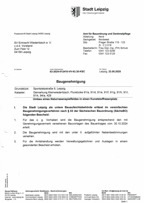 Leider war es lange still um unser schönes Kunstrasenplatzprojekt. Nach unserer sensationellen Crowd Funding Aktion, die ihr alle so herausragend unterstützt habt, wurde im Hintergrund weitergearbeitet. Mit der Zusage von Fördermittel kam eine Reihe von Nachforderung. Insbesondere mussten wir den Bauantrag stellen, um die Baugenehmigung zu erhalten. Mit hervorragender Unterstützung unserer Planer von Grünplan haben wir im Oktober 2024 erstmals alle Unterlagen eingereicht. Im Dezember 2024 erfolgte die offizielle Übergabe des Zuwendungsbescheids durch Stadt und Land im Rahmen eines Festakts bei Lok.